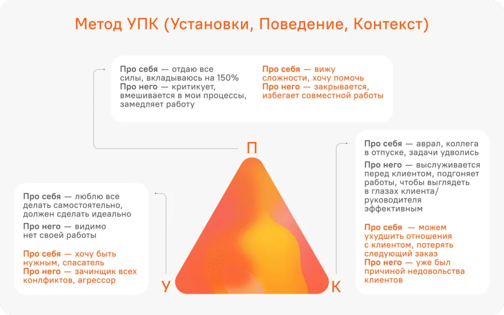 Обучайте коммуникации. Часто люди не знают, как правильно выразить своё недовольство или решить конфликт. Поэтому важно обучать сотрудников общаться конструктивно. Например, снизить напряжение в коллективе помогает метод УПК — Установки, Поведение, Контекст.